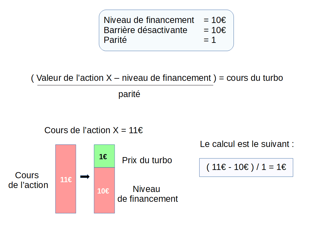 Imaginons que vous achetez le turbo alors que l’action X vaut 11€. Le calcul du prix est alors le suivant : (Cours de l’action X, niveau de financement) / parité = prix du turbo. Dans notre cas : (11€, 10€) / 1 = 1€.