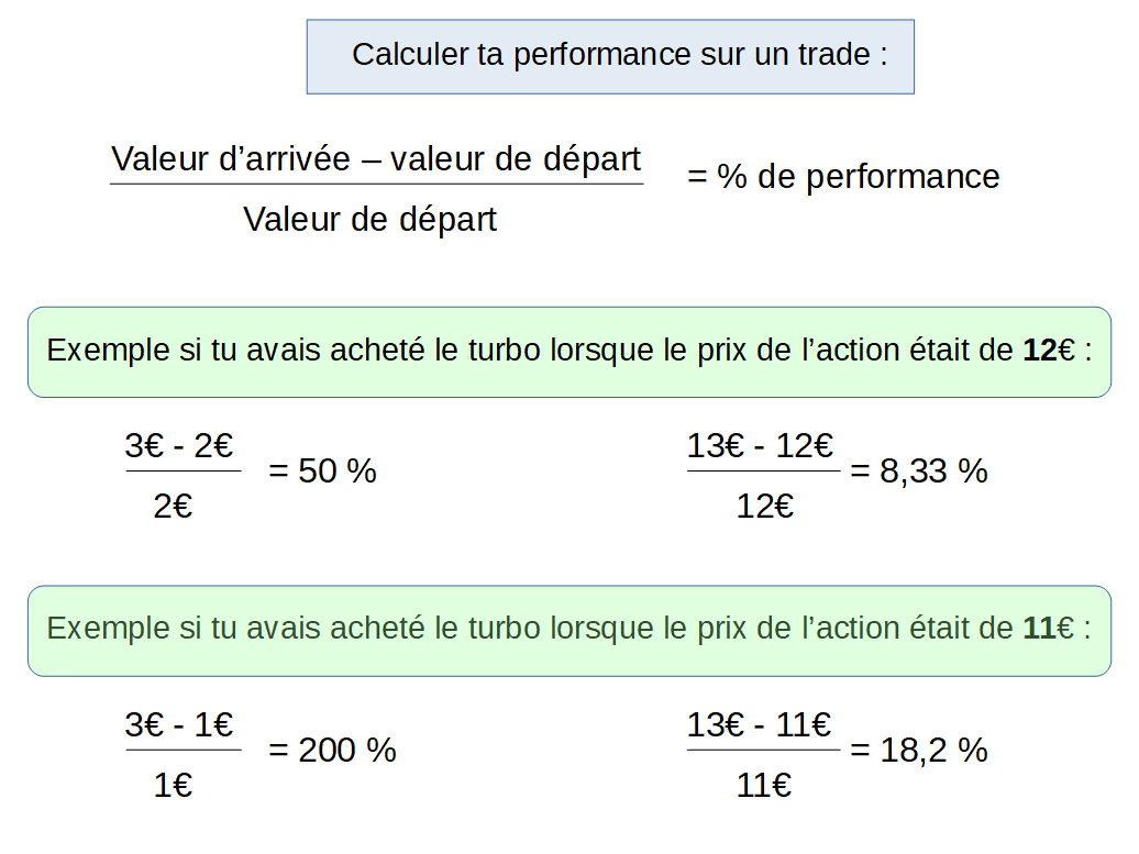 Si le cours grimpe à 13€, refaites le calcul : (13€, 10€) / 1 = 3€. La valeur du turbo atteint alors 3€. Vous avez investi à 1€, vendu à 3€ : soit une progression de 200%. Pendant ce temps, l’action X n’a progressé que de 18%. Le turbo joue donc pleinement son rôle d’amplificateur de performance… à condition que le marché évolue dans le bon sens.