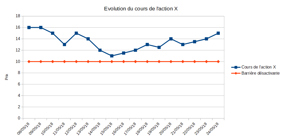 , si vous vendez le turbo, si le prix de l’action X est de 13€, votre turbo vaudra 3€, comme dans l’exemple précédent. Votre performance est de 50% parce que vous avez augmenté de 2€ à 3€ dans cette opération. Le cours de l’action X aura évolué autour de 8%, donc votre performance sera inférieure à celle que vous auriez sur investissement si le cours de l’action X était de 11€ et donc plus proche de la barrière de désactivation. D’autre part, vous êtes moins risqué, car pour toucher la barrière de désactivation, il aurait fallu que le prix de l’action X ait chuté d’un peu plus de 16%.